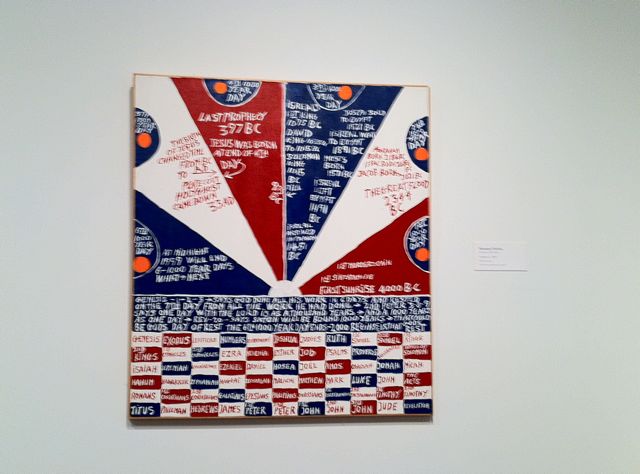 We were in the American Folk Art room at the Milwaukee Art Museum. There was a painting by a little known folk artist; a pie chart of history according to the Bible. Blue, White and Red pie shapes, each pie representing a “one thousand year day” and all of the “important” events that occurred on that 1000 year day, like the first sunset, the great flood, and the birth of Jesus.